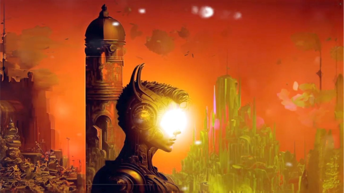 The beasts recoils, slows its spiraling and—suddenly—we emerge from the icy torrent into the calm of the mesosphere, hovering at the crown of the uncompleted tower. The warm glow of dawn greets us from far and wide, softly illumining the desert landscape beyond the putrefying sprawl of New Babylon. The serpent, still encircling—keeping me aloft—now has its gaze fixed on a figure standing atop the tower: a woman with sky-colored skin donning the oracular head-prosthesis of Pythia. She turns, and, upon seeing me, lifts her spirits from the sullen pits of hell to what I could only describe as joy—joy of the dead in resurrection. She inclines her head toward me—a subtle bow. Inwardly, I hear her voice: